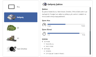 The data production process is initiated by selecting 2D or 3D project templates according to user requirements. With the 2D template, orthophotos and surface models are generated, while the 3D template allows the creation of detailed outputs such as point clouds and mesh models.