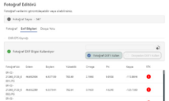 EXIF information in the photos is automatically read and integrated into the system with X, Y, Z coordinates and orientation parameters. RTK-supported flight information can be viewed; positional accuracy can be further improved by loading data from an external file.
